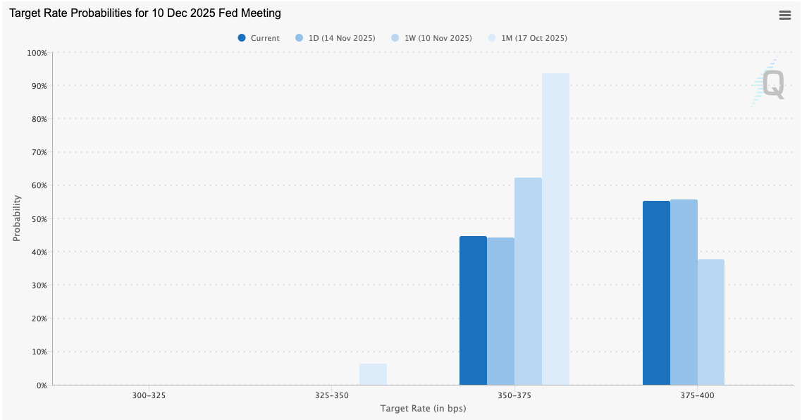Bu veri eksikliğine ek olarak CME Group’un FedWatch Tool verileri, piyasaların Fed’in 10 Aralık’taki bir sonraki toplantısında faiz oranlarını %0,25 artıracağına artık ikna olmadığını gösteriyor.