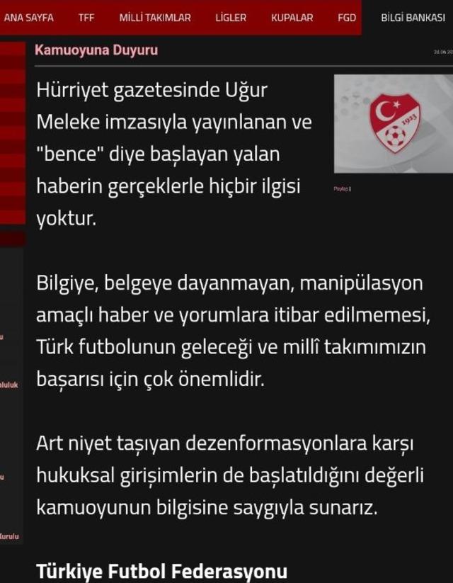 Meleke'nin şaşırtıcı yazısına TFF'den çok sert bir yanıt geldi. Yukarıdaki açıklamada: “Bilgiye veya belgeye dayanmayan, manipülasyon amacı güden haber ve yorumlara itibar edilmemesi, Türk futbolunun geleceği ve milli takımımızın başarısı açısından büyük önem taşımaktadır. Kötü niyetli yanlış bilgilendirmeye karşı girişimler başlatıldı.” ifadelerine yer verildi.